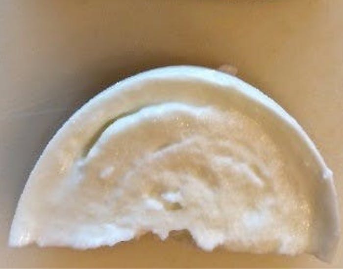 Once cut, the texture differences are even more obvious. The cow (top) has a tighter paste while the buffalo (below) is more lacy.