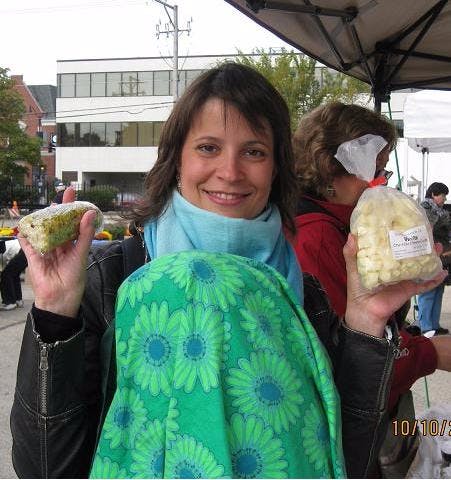 Anway, in between hand-warming sessions, I stopped by a local cheese stand and picked up a really cool blue cheese/mascarpone/pistachio nut roll. Now I am not normally a nut roll fan, but OH MY was this delicious. If I were a tackier person, I would have eaten it in the middle of the market like a candy bar. Being that I am dainty and proper, I waited to inhale it till we got home. In my left hand is a bag of super-yummy cheese curds. Mild, tangy, creamy. I was a bit disappointed, however, that the tell-tale squeak of many cheese curds was absent. Probably cause it was SO DARN COLD!